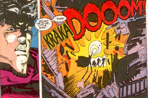 S'ym will be a part of a lot of New Mutants issues going forward but he's never more powerful than he is here (and yes, that includes when he's taken over Limbo in a future storyline). He manages to throw everybody around. Outmuscling Sunspot, standing still as Cannonball bounces off him, and, most of all, managing to swipe aside even Professor X. This is a particularly great shot of S'ym lashing out.