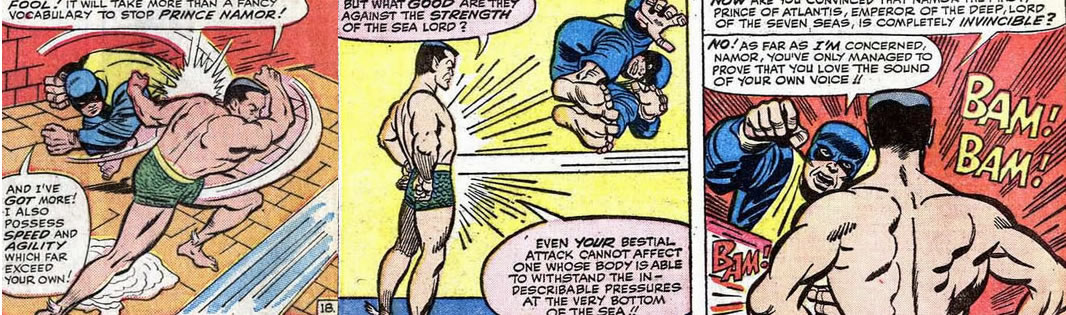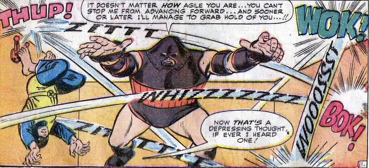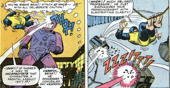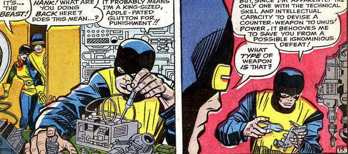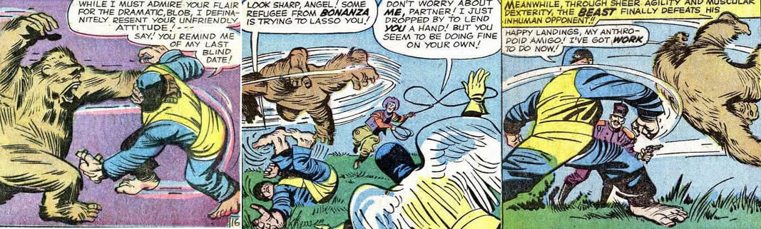 this Let's check up on the Beast's abilities and capabilities. AgilityThe Beast has many powers, primary of which is agility. You can see that on display below as he tests himself in the Danger Room in the very first issue of Uncanny X-Men. ![]() Here again is Beast's incredible agility as he 'twirls' down a pole while being fired at by Blob's circus friends. ![]() Here, Beast disarms some gunmen hired by the Vanisher. ![]() The Juggernaut is powerful enough to beat the Beast but he has to catch him first. Once again, Hank's wondrous ability serves him well giving the other X-Men time to regroup. ![]() enlarge Beast is also weaker than the first Sentinel (we'll look at his strength level later) but the robot can't catch him either. ![]() enlarge ReflexesThis agility is matched with lightning-like reflexes allowing him to dodge small firearms like the one being used by Mastermind, one of the Brotherhood of Evil Mutants. ![]() Wall-ClimbingI've always enjoyed that Beast can do a Spider-Man by climbing up walls or attaching himself in the ceiling as shown by the next two panels. In truth, Beast needs a toehold to accomplish such feats but it's amazing to see anyway. It's a shame that this ability is not shown very often these days. ![]() ![]() Attack StylesNow, let's talk about Beasts straightforward attack capability. Jumping on foes with both feet is a favorite maneuver as he does with the Blob. ![]() The first time the Beast meets the Blob, Hank tries to incapacitate him with a straight on headbutt. It won't work but it's powerful enough to destroy the door behind the Blob. ![]() StrengthWho's stronger, the Beast or a gorilla? This answers the question. ![]() enlarge The Beast's strength fails him against the one true Submariner. Namor is strong enough to fight it out with the Thing and is as tough as Luke Cage. The Beast simply isn't fighting in his weight class here. ![]() enlarge In another show of strength, the Beast tears off a metal wrapped around Cyclop's head, put there by Magneto. ![]() The Beast is far stronger then an average human being. He is the strongest of the early X-Men but he cannot match strength with the middle and heavy weights of the Marvel Universe - his agility is still his main physical capability. BalanceTogether with agility and strength, the Beast also brings an amazing sense of balance to the table. The following two panels display highwire acts. ![]() ![]() DexterityThe Beast never wears shoes because he has prehensile feet. Here he catches one of Magneto's missiles. ![]() After a feat (no pun intended) like that, catching Captain America's shield should be easy when the X-Men tangle with the Avengers. ![]() The Professor has a mild panic attack because the Juggernaut is arriving, so the team prepares a defensive perimeter, including Hank who lays down some electrical cables Beast-style. ![]() Here's the Beast walking with his hands and carrying the ice man with his legs. ![]() ToughnessThe beast is also tougher than the average human. Jumping down from a third story window? No problem. ![]() enlarge IntellectOk, enough about the Beast in uniform. What's Hank McCoy like? He loves to study as shown in the panel below. ![]() Now let's get into a very important capability of the Beast - his intellect. Here, Beast encounters Unus the Untouchable and is able to build a machine to beat Unus. ![]() enlarge ![]() enlarge The nefarious Lucifer attacks the Professor and Hank builds a protective helmet for him. ![]() The Beast is numbered among the intellectual powerhouses of Marvel - and remains the technical brain of the X-Men. I would put him right under Hank Pym (Yellowjacket) and equal to Bill Foster (Goliath) but well below the two giants of the Marvel Universe: Reed Richards and Tony Stark (I have a feeling Bruce Banner would make this group if he didn't keep turning into the Hulk). Hank McCoyStudious he may be but Hank is no introvert. Witness the welcome-to-the-school kiss he gives new arrival Jean Grey in the first issue of the X-Men. ![]() The big feet has been a point of focus in the early X-Men issues. Hank just can't resist taking off his shoes in a jazz bar. Look at the expression on Bobby's face! ![]() Hank's special shoes. ![]() Hank McCoy is nice and affable but he has his limits. He saves a little boy. But what does he get for it? An anti-mutant lynch mob. ![]() He comes home in a sorry state and quits the X-Men to . . . ![]() . . . become a professional wrestler. This is perfect for the Beast's abilities but he's foray into wrestling is short-lived since he'll encounter Unus and go back to the X-Men; he would have grown bored with the lack of intellectual stimulation anyway. ![]() Hank is closest to Bobby whom he goes along with during their time off. Scott is aloof and worried about his optic blasts and the playboyish Angel keeps trying to hit it off with Jean Grey. ![]() Unlike other hapless mutants Hank is blessed with understanding parents. The panel below is from a storyline that includes the origin of the Beast. ![]() |