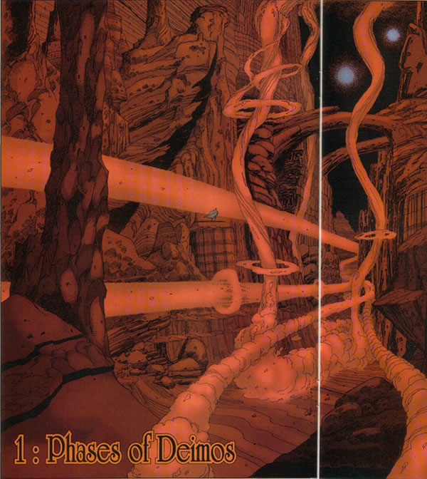 Note the red crags and the weird, swirling cloud tendrils? It's absolute sci-fi goodness. The guy in the flying carpet lands and meets this green alien