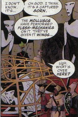 And just like that I know what this alien is - it's a Barsoom, from Edgar Rice Burrough's Martian novels. I haven't read a single novel but I did read Marvel Comic's Warlord of Mars, so the green guy with the four arms and tusks is familiar. It's just absolutely delightful how Moore uses this stuff. Soon the magic carpet guy, Gullivar, is conducted to the presence of another human whom he calls 'John'. It's John Carter! The discussion involving 'the Princess' confirms it. Unfortunately, something bad seems to have happened to the Princess, who could be no other than Dejah Thoris. The discussion of these two men is incredibly interesting. Mars seems to be inhabited by five races : Humans, Hithers, Xorns, Barsoomians and a parasitic race referred to as Molluscs. Everybody is at war with the Molluscs and the scene is the eve of a great battle. The formation of the armies is shown in fascinating panels showing the stylized Martian landscape. Pretty soon the battle is underway and the Mulloscs reveal themselves as they ride out with their war machines.