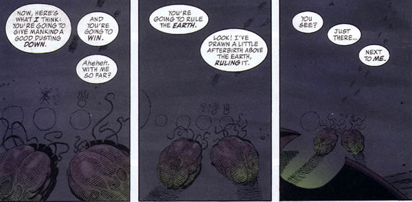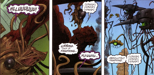 Yuck. The following two panels shows the mollusc struggle in the higher Earth gravity and fall out of the craft. I find these panels also very icky. Yech. Clams for dinner anyone?