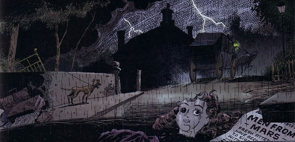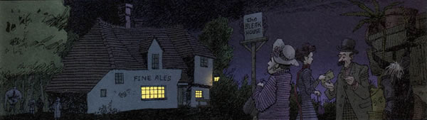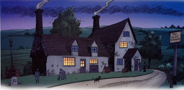 Go get them Hyde! It's amazing how when we were on our own, no alien in sight, Hyde was a monster and a concern for us. When the aliens arrive, Hyde is one of us, a fellow defender and friend. It's the old theory of the secret to world peace being an alien invasion. Anyway, the others manage to restrain Mr. Hyde for more opportune moments in the future. British government response to this crisis is admirably organized. The government brings its regiments in to begin shelling the landing crater, and some newer ones that have appeared throughout the country. In the meantime, their team of special agents, the League, is kept on hand but not in the forefront. The inn that the League uses as a 'field office' of sorts has been evacuated and it's called "Bleak House", maybe from the Dickens novel. I love this inn. Living in the city myself, seeing all this space, and the nearness of nature, is just glorious. I'd live here in a pinch.