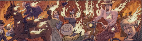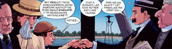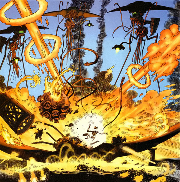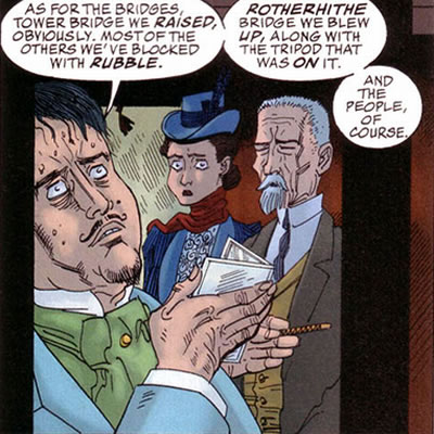 Hyde has provided the necessary time for H-142 to be deployed. The tripods fall one by one. The story ends with the end of the League itself. Hyde and Griffin dead. Nemo departs, deploring the chemical attack resorted to by Mycroft and Bond. |