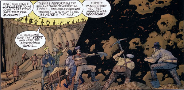 As the group turns in for the night, we have some remarkable panels that reveal the special relationship between Mina Murray and Mr. Hyde. A relationship that was coming to the surface during the first League of Extraordinary Gentlemen story when they were infiltrating Moriarty's skyship.