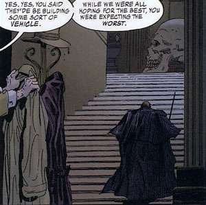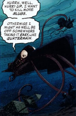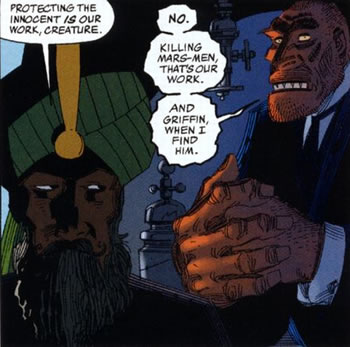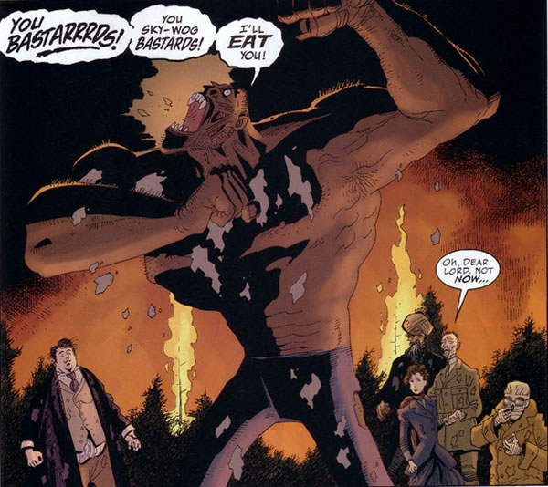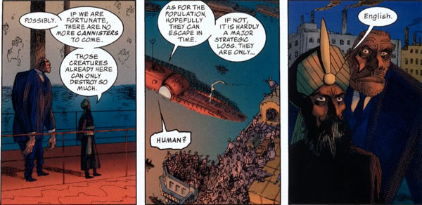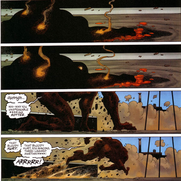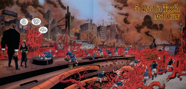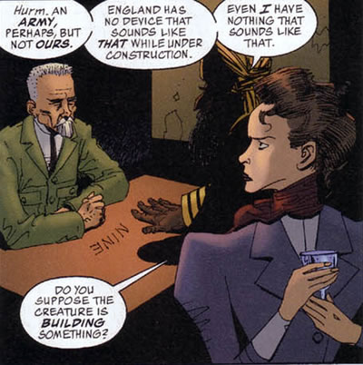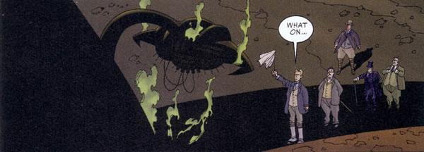 If Mina Murray hadn't been attacked by Dracula she would not be able to countenance even a moment's talking with Mr. Hyde. But, as she says, she knows of worse horrors. As for Hyde, he is showing a tremendous level of humanity here - the man within the monster; under the surface, distorted, but there, nonetheless. Stan Lee should have done this with the Hulk in the 60s. Mr.Hyde is an excellent Moore/O' Neill creation. Let's recall the many sins of Hawley Griffin, the Invisible Man. From the first story, he raped those poor girls in the Edmonton School. He brutally killed that constable. And, he was about to abandon the League to the falling skyship. Griffin is becoming the villain of the piece and here is his personal apex. He betrays the Earth to the invaders because he has come to the conclusion that England, and the Earth, has no chance.