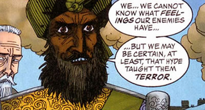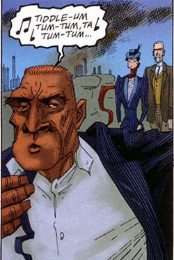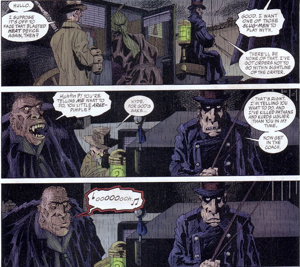 I love the artifacts. I tried researching some of the labels in this panel, but they seem to be fictional. The League goes around via a coach provided by the Government. The driver of this coach is Samson, a veteran of the British wars. I consider him a de facto member of the League - together with Detective Dupin from the first story - for the simple reason that he manages to stand up to Mr. Hyde. Witness . . .
