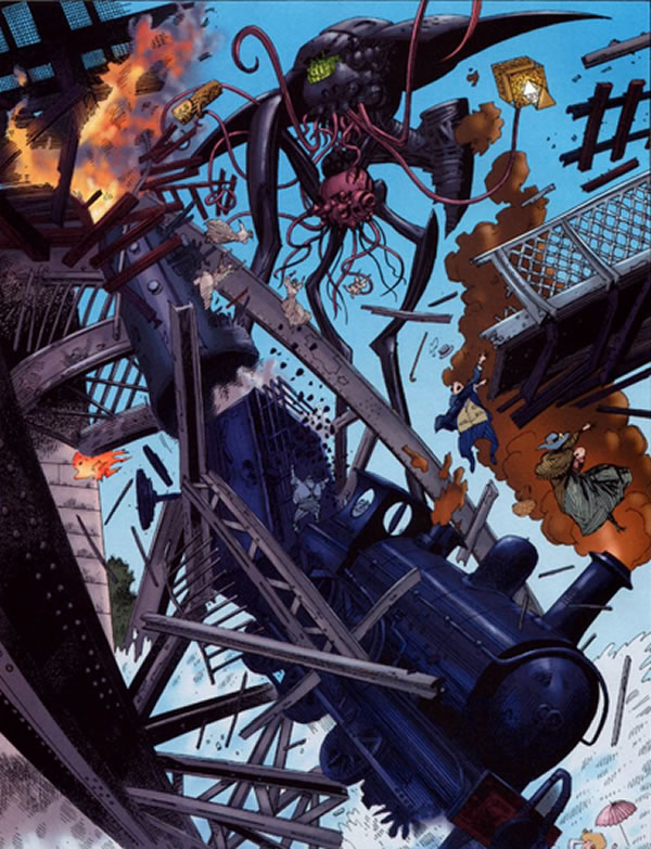 Looking at this panel you know it's going to be bad for the Invisible Man. Remember Hyde can see him. Personally, I'm looking forward to it. As a consideration for the traumatic event, Mycroft Holmes sends both Mina and Quatermain on a side mission away from the immediate danger. We are shown the tripod attacking a passenger train.