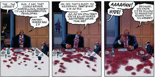 Apparently the blood is Griffin's blood from Hyde's brutalizations. It's suddenly appearing in front of everybody because the Invisible Man's invisibility is fading - and it's fading because he's dead. I can't think of a better way of showing the demise of the Invisible Man than this. Moore is wonderfully creative. On to the rest of the story . . . The most bestial member of the League is the one with the most developed intuitive capability. Hyde sensed that Griffin was in the Museum, now he knows of his own impending death.