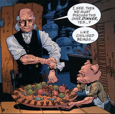 It's a nice touch from Moore that the Dr. Moreau names all his creations with the designation 'H' and a number. 'H' for hybrid. Thus, the bear that Mina and Allan first encountered is H-9. Apparently the ninth creation; the doctor is creating H-216 these days. The government is interested in H-142, the streptococci/anthrax hybrid they plan to use against the Molluscs. Before leaving, the doctor invites both his guest to a little repast. Look at the food.