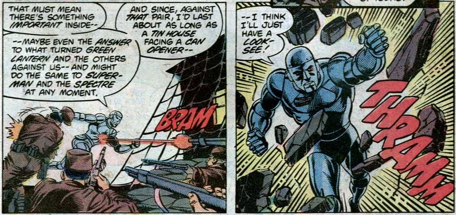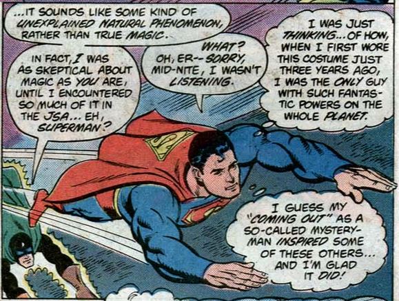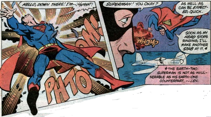 Note the box to the bottom right from editor Len Wein noting that the Earth-2 Superman isn't as invulnerable as the Earth-1 (Justice League) Superman. I find that detail very welcome since it could lead to more interesting stories.