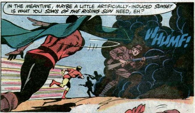 The heroes arriving by air over Oahu are mistaken for enemy planes and the Americans strafe them with anti-aircraft ordinance. Superman intends to fly down and tell the soldiers there's nothing to worry about but . . .