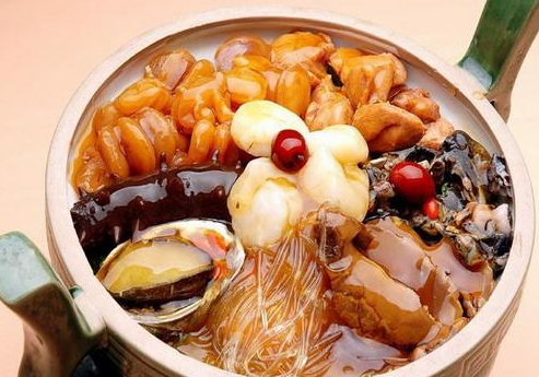 - Over low heat, allow the contents of the pot to simmer for 1 1/4 to 1 1/2 hours. Turn off the heat and allow the pot to rest for 10 minutes. Remove all the foods from the pot to a large heated serving platter. Garnish the platter with the quail eggs. Place the liquid, now a rich broth, in a heated tureen. Remove the cheesecloth bundle to another heated plate, discard the cheesecloth, remove the contents, slice the abalone thinly, and arrange it with the other ingredients as an accompaniment.