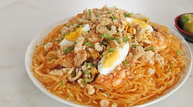 - Garnish with sliced egg, shrimps, spring onions, and garlic.
